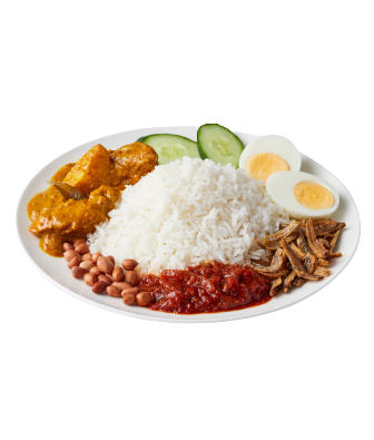 Malaysia’s national dish: fragrant coconut rice served with spicy sambal, crispy anchovies, roasted peanuts, sliced cucumber, and hard-boiled egg. A harmonious blend of creamy, spicy, and crunchy flavors wrapped in banana leaf.