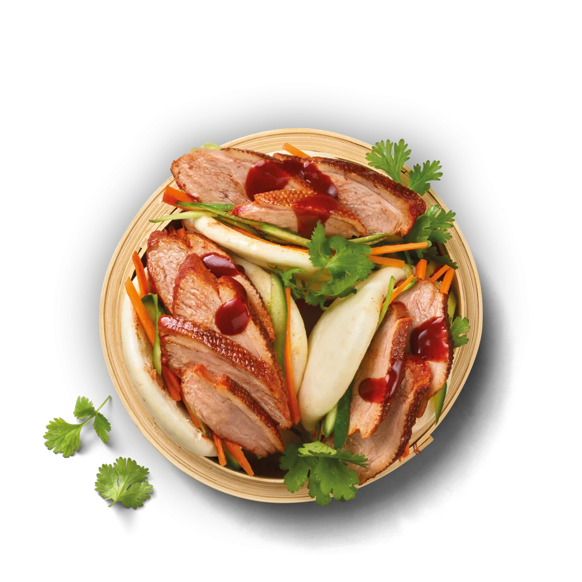 Air-pumped duck dried overnight, glazed with malt syrup, then roasted until skin crackles. Thinly sliced and served with steamed pancakes, hoisin sauce, and fresh scallions. Celebrated for its paper-thin, crispy skin and succulent, flavorful meat.