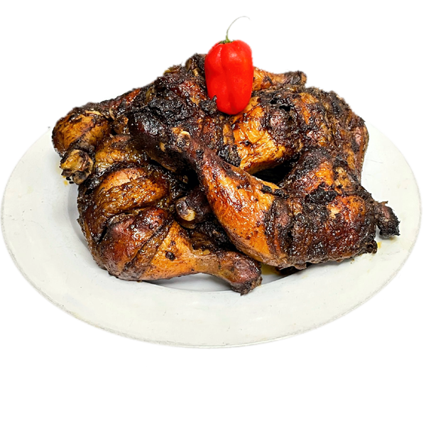 Jamaican chicken marinated in a fiery blend of scotch bonnet peppers, allspice, thyme, and ginger. Grilled over pimento wood for smoky, spicy-sweet flavor with a charred, aromatic crust and tender, juicy meat inside.