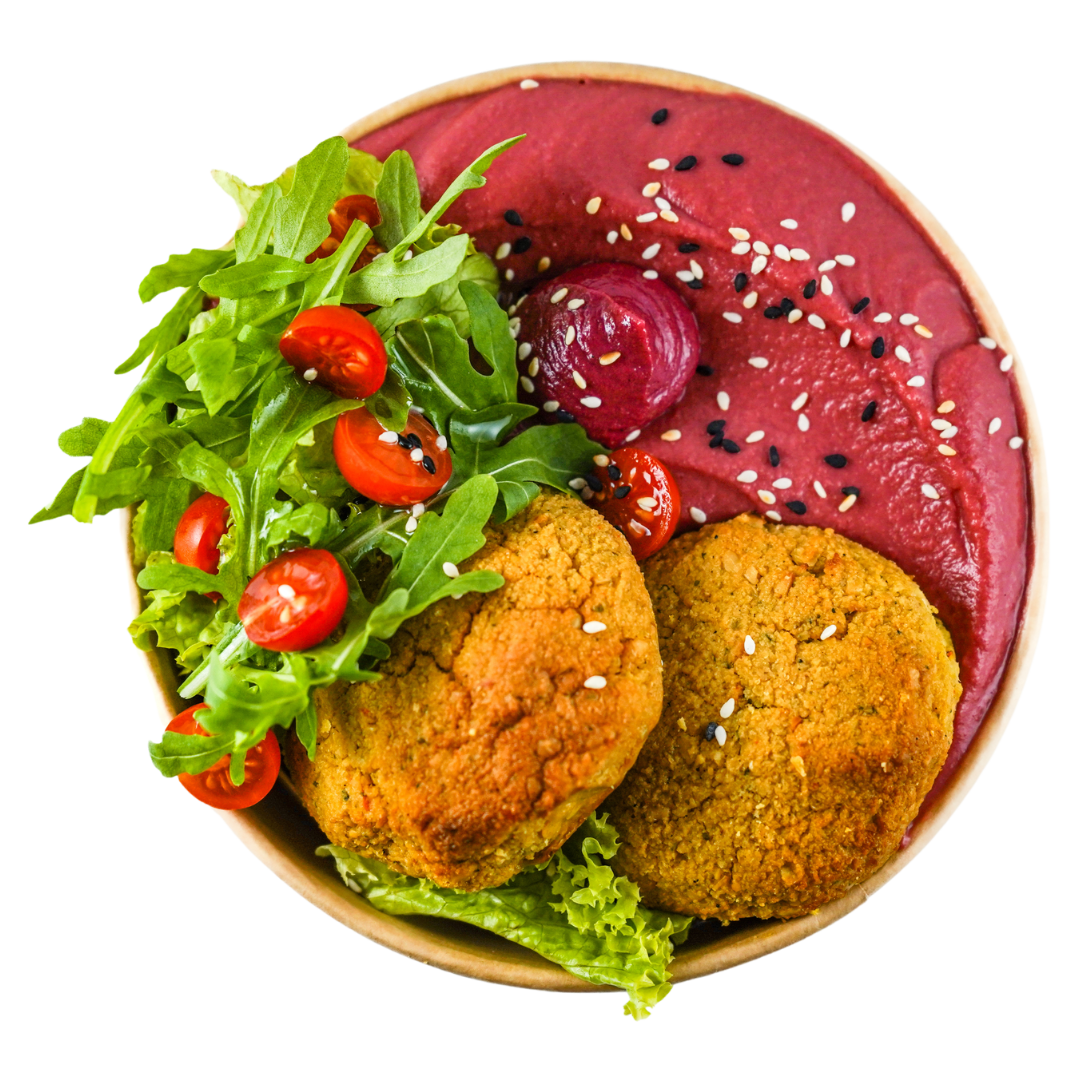 Creamy hummus from blended chickpeas, tahini, lemon, and garlic. Paired with crispy falafel—spiced, ground chickpea patties, deep-fried until golden. Served with pita and fresh veggies for a perfect Middle Eastern meal.